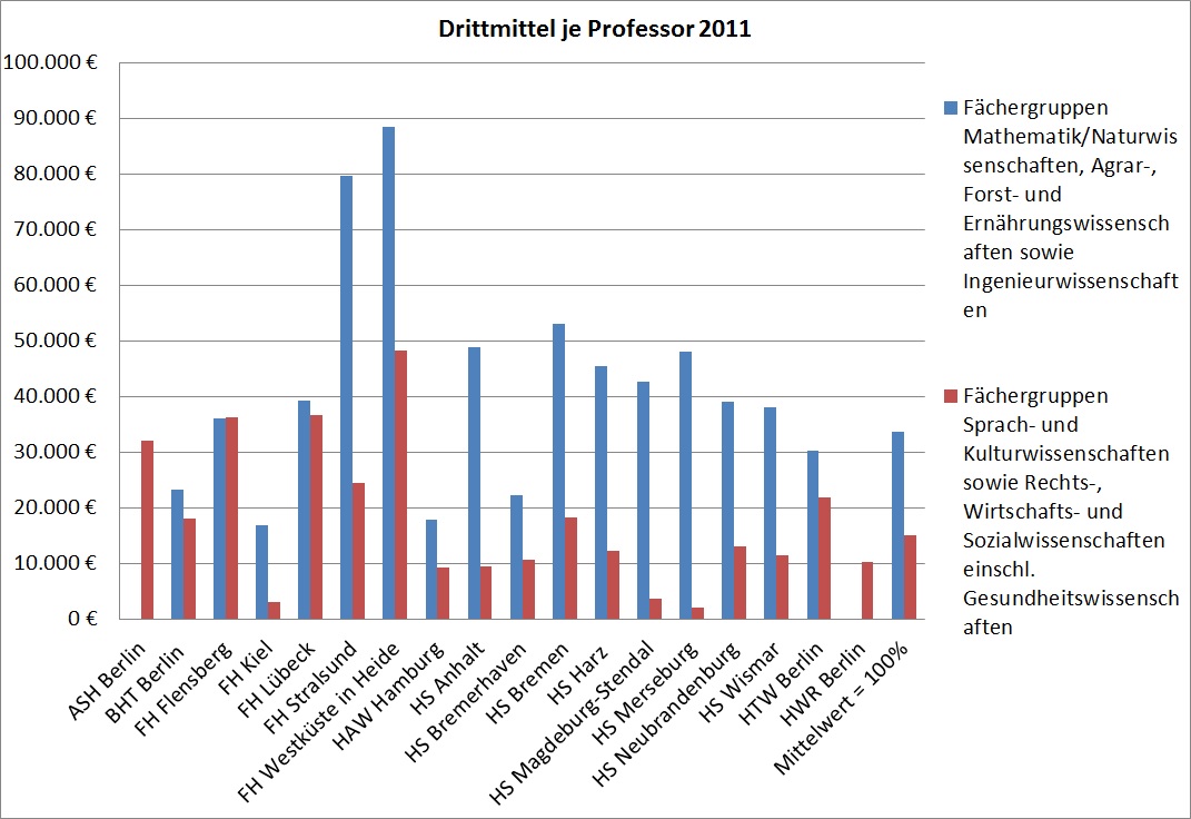 Als Indikator für Forschungserfolg dienen die Drittmittelausgaben je Professor, die in den letzten Jahren gestiegen sind. Als Drittmittel bezeichnet man die Anteile an der Finanzierung von Forschungen, die aus Privatwirtschaft oder öffentlichen Forschungsförderungen stammen. In den MINT-Fächergruppen lagen die durchschnittlichen Drittmittelausgaben 2013 mit rund 33.600 € circa 40 Prozent über dem Wert von 2009. In den Fächergruppen Sprach- und Kulturwissenschaften ebenso wie Rechts-, Wirtschafts- und Sozialwissenschaften stiegen die Drittmittelausgaben auf durchschnittlich 15.100 € beziehungsweise um 30 Prozent im selben Zeitraum.